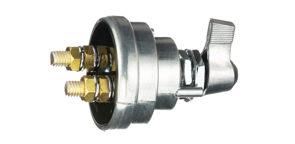 Level operated, 6-36 DVC, 180 Amps continuous capacity, and 1000 Amps in Rush S.P.S.T. (Off-On) two stud terminals. For battery circuit only, does not disconnect alternator or generator field circuit. On vehicles equipped with alternators, engine must be shut off to avoid potential damage to alternator diodes.